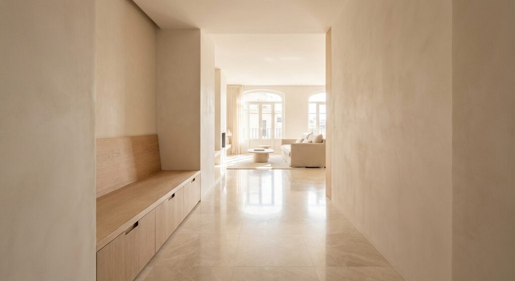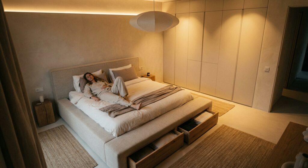 Implementation: Floor-to-ceiling bedroom wardrobes, kitchen pantry pullout systems, and an entrance built-in bench with 1.2 cubic meters of hidden storage. Storage capacity increased from 18 to 43 cubic meters without reducing living space.