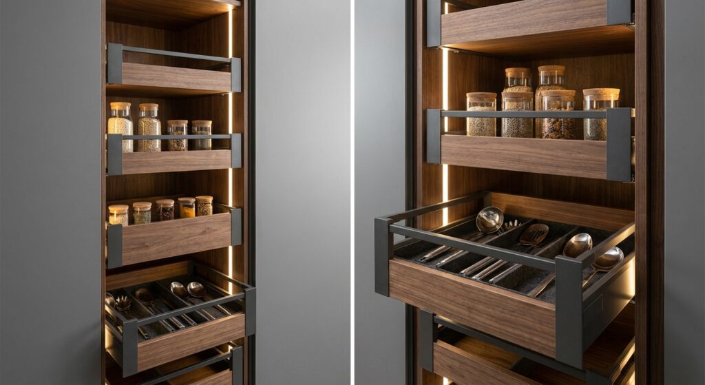 Kitchen optimization typically recovers 40-60% more storage through pull-out pantries, corner carousel units, and vertical spice racks. Closet systems with adjustable shelving and dual hanging rods increase garment capacity by 85-120 items per linear meter.