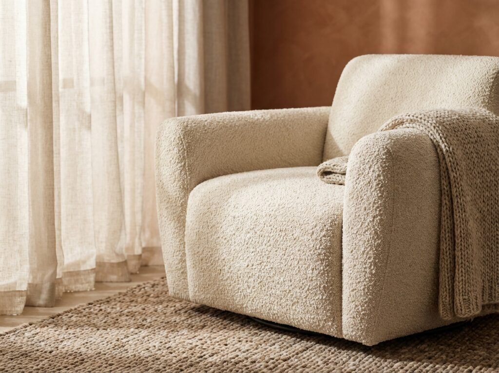 | Bouclé (Performance) | Looped texture with stain resistance | Low (wipeable surfaces) | Family rooms, pet-friendly spaces |